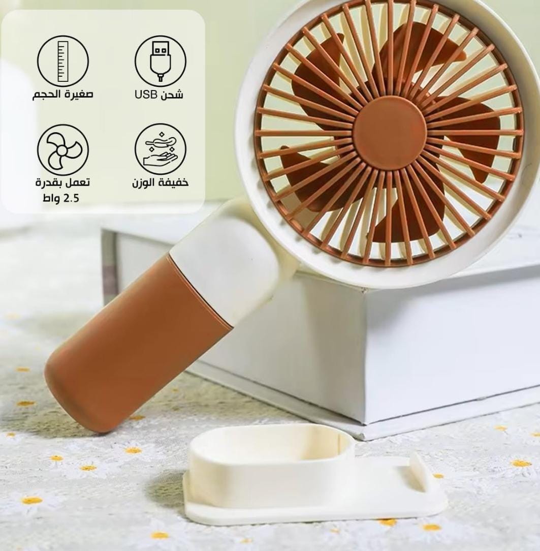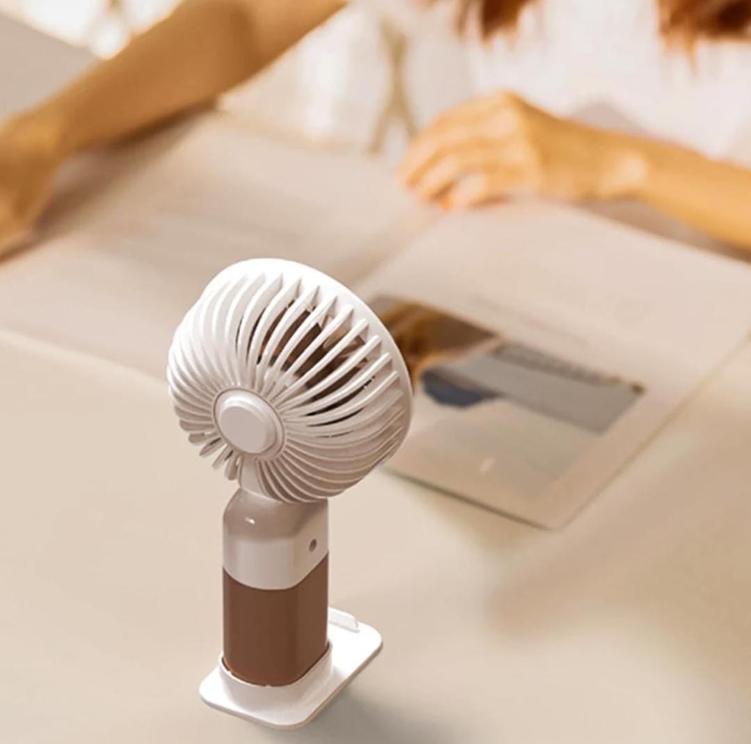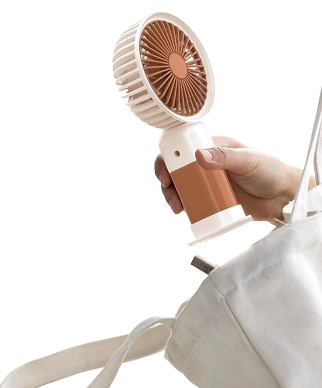 he image shows a portable mini fan, likely rechargeable via USB. Helpful information includes: