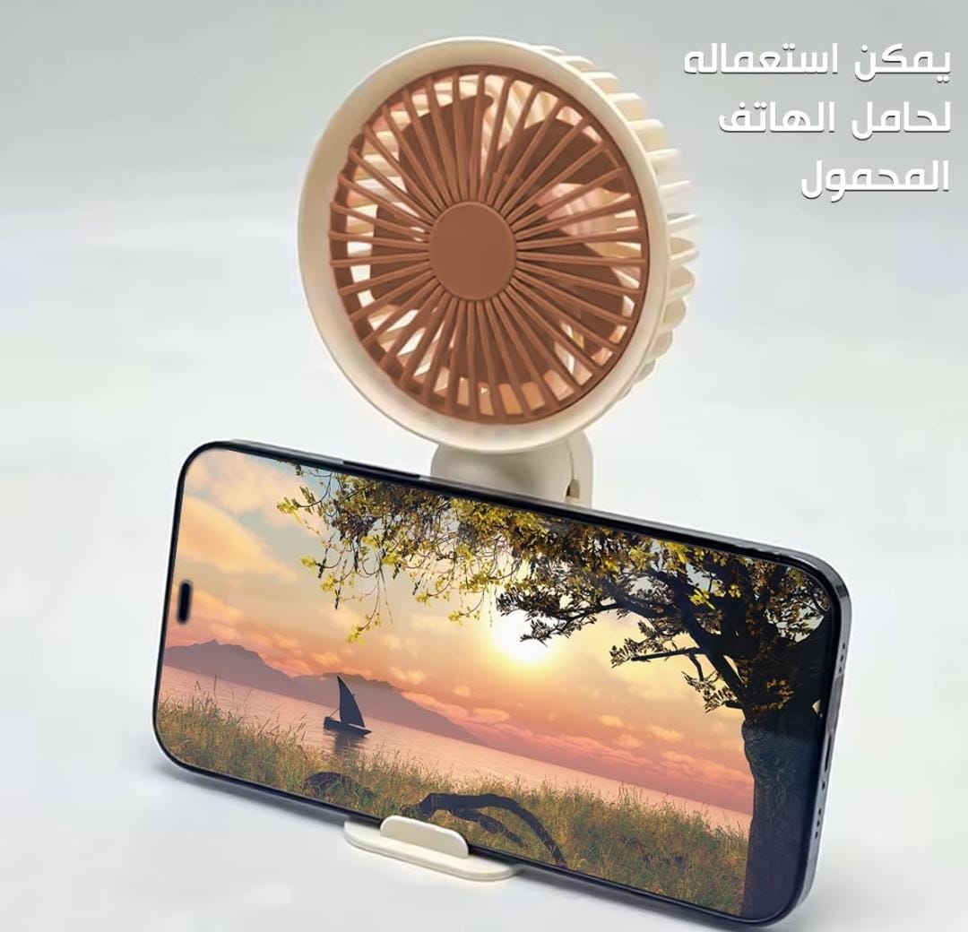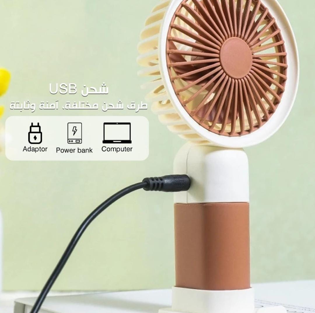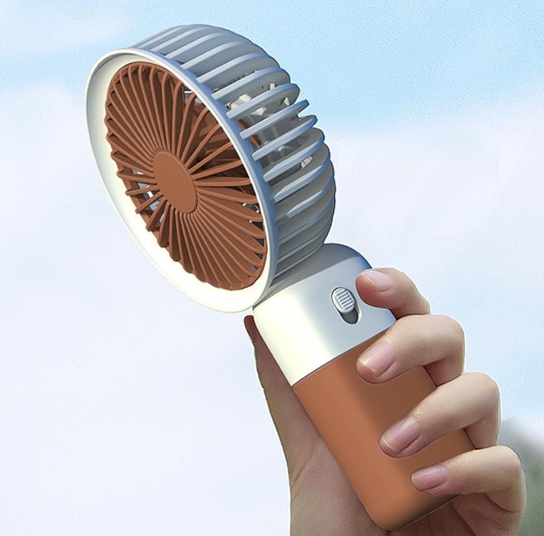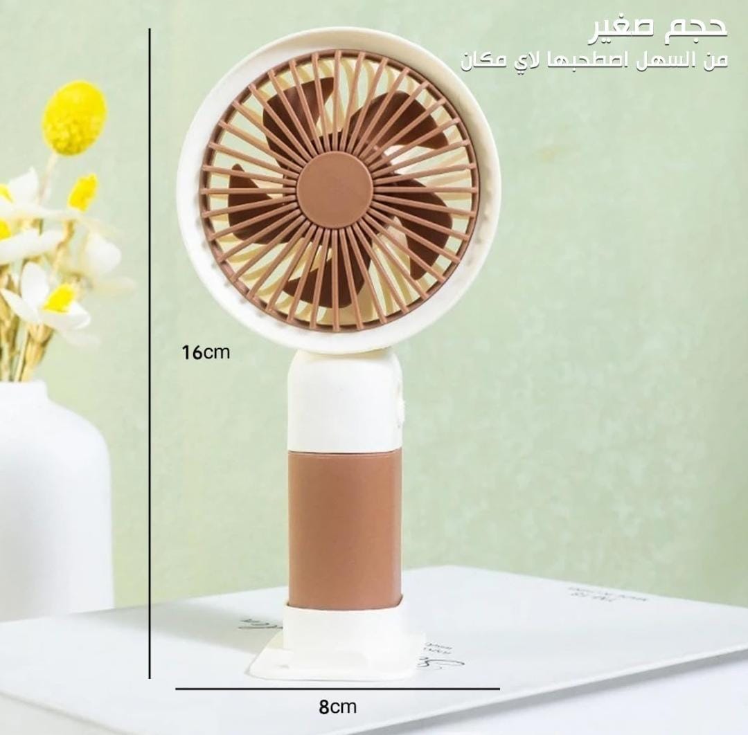 he image shows a portable mini fan, likely rechargeable via USB. Helpful information includes: